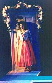 The charming, effective set by Rae Smith remains essentially the same through the three acts, with two raised platforms spaces, a stage in the foreground just large enough to accommodate all seven characters, plus unique sur/sub-titles, and a 'left over' space back right. They are connected by raised passageways to three garlanded doors, the whole balanced but not symmetrical, just like the actors in this serious comedy of life. Metaphorically, each of them needs to go through a rite of passage, an adjustment, to reach the goal.