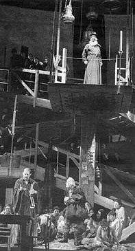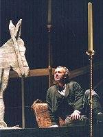 [pict, credit Bill Cooper] Conceived as a mass opera, with choruses of villagers and refugees the main protagonists, the large cast worked well together and every small part was well taken. Even the main characters have relatively small parts; those who must be mentioned include the two opposing priests, Esa Ruuttunen and Gwynne Howell, Jorma Silvasti as the shepherd/Christ, Marie McLaughlin as Katerina/Mary Magdalene, Robin Leggate reluctantly assuming the destructive role of Judas Escariot, and Timothy Robinson as the pedlar Yannakos/St. Peter (Illustrated with his Ass) who repents, confesses and is forgiven evil intent. Charles Mackerras inspired the orchestra with conviction in bringing this brave venture to such gratifying success, another notable service to Czech music by its most famous champion.The internal, individual struggles, the external conflicts, the different and differing perspectives, and the interweaving of complex but accessible themes are pulled together by a sensational revolving set by Stefanos Lazaridis. This unified and unifying open structure of great height makes the events weaving all the way up and through it transparently accessible. The way leads from a cave-like underneath, up a steep hillside through small platforms which double up as interior spaces. The inside and the outside are combined and can be seen to give metaphorical expression to the way the personal becomes subject to the social and vice versa. The large bells at the apex of the set are not only made to ring, but seem to resonate more widely with Martinu's early life, spent in a bell-tower. Interspersing oil lamps with the bells further accentuates the weaving together of the personal interior with the social exterior elements of this drama.