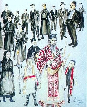 This production [Photo, The Times], first seen in Bregenz last year, is directed with thoughtful artistry by David Pountney. With the help of a stunningly effective set by Stefanos Lazaridis a textual unity, in tune with post-modern sensibilities, is created out of a myriad of episodic, fast moving musical, verbal and visual elements.It is no mean achievement to get across to a secularised audience moral arguments dressed in religious terms. Broad themes borrowed from Christian mythology are interwoven with historical and political elements. We are confronted with an established, but amoral, hierarchy that shores up its authority with pomp. It is represented by the priest Grigoris, who makes his first appearance with his entourage dressed in red and gold vestments. In stark contrast the people are all dressed in black, except for the village elder, dressed in white and also part of the establishment, who needs to stand up and out against the common folk. The refugees who are led by their priest Folis represent the counterpart to this established order. They are dispossessed but moral authority is vested in them. Caught between these two conflicting poles are the villagers. For some of them, especially Manolios, the Christ in the village Passion Play and Katerina as their Mary Magdalene, this conflict becomes intensely personal. For all of them chosen the responsibility towards, and understanding of, the Gospels become more than a play for acting in. They are led to enact 'The Word'.
