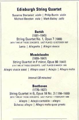 Another of those evenings spent with four players that made for as rich an experience as can be provided by a full orchestra. Founded in 1960, the Edinburgh String Quartet has had some changes of personnel and is in fine form under its new leader, Susanne Stanzeleit. Theirs was a well chosen programme in which each work reflected upon the others.The Beethoven has some strange features, which it was a pleasure to follow on a score given to me on my 1953 birthday for a performance at the Victoria & Albert Museum by the great Vegh Quartet. The allegro middle section of the adagio is light as a Mendelssohn scherzo, and the trio of the following true scherzo has 8 bars for its first part and no less than 28 with running triplets, for the second. Beethoven was already breaking moulds. Bartok's first looks backwards and forwards, with reminders of Tristan and of the Schonberg of Verklarte Nacht, a true Hungarian style based on peasant music emerging in the eventful finale of a piece which plays without a break and, in this performance, gripped from beginning to end.