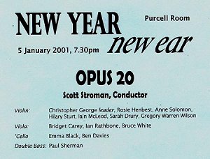 Getting in before the PLG's regular January slot at the Purcell Room, which regularly opens the season, Opus 20 greeted the New Year with a programme of British novelties framed by popular Bartok. Only a very small audience attended this showcase for recent British music, and it had something of the character of a musical party for family and friends - no information was provided about the composers, presumably on the assumption that we all knew them well enough.The four pieces of Reeman's 'cycle' (1993-99) have been brought together for the first time; it was a mistake. Scott Stroman told us that Keeling and Opus 20 'had grown together'. He warned us that Passion was a long work - "but worth it" - seeking to pre-empt criticism that at 45 minutes this deliberate, schematic and, mainly slow and portentous, tonal music over-weighted what became a 2½ hour concert. There seemed to have been no obvious development during the long years of its creation and the pieces would better be given one at a time. Red is destined for a CD of Keeling's arrangements of Fripp & King Crimson; I guess it must have sounded better originally on electric guitars and drums! LeFanu's work was the most interesting. It tested the young players' intonation and at first hearing the music seemed to slither around without a clear focus for its material; its snatches of melody heavily chromatic, with microtonal inflections, 'layers of music constantly re-shaping themselves'.