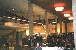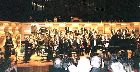 The public areas surrounding and connecting the performance spaces are vast, beautifully lit and with plenty of seating; a really inviting and visually interesting place to sit in and wander around.During our week in Rotterdam we took in two prestigious concerts in the Grote Zaal. Peter Donohoe gave there a fine account of Bartok's 3rd piano concerto with the excellent Radio Philharmonic Orchestra under Claus-Peter Flor, [below] and enterprisingly framed by Janacek's Taras Bulba and Shostakovich's eccentric and untypically entertaining 9th Symphony. They all appeared to relish playing in a hall which separates and clarifies textures, making everything clearly audible. Earlier in the week, Sir Simon Rattle had a capacity audience there spellbound by Haydn's Die Jahreszeiten (The Seasons) with the Nederlands Kamerkoor of about thirty singers and Frans Bruggen's Orkest van de Achttiende Eeuw. The soloists Christiane Oelze, John Mark Ainsley and David Wilson Johnson were ideal, and afterwards there were prolonged, fully deserved standing ovations for all concerned. This was a performance for the 21st century, using 'authentic' instruments and historically informed playing style, but with infinite subtleties of expression unlikely to have been possible, or even sought, in the 18th C, every detail of which told with clarity in this large state-of-the-acoustic-art modern auditorium.