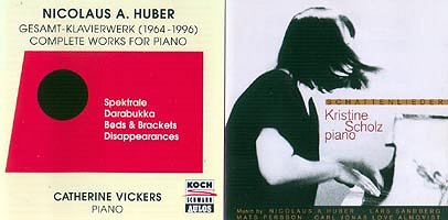 All the three Huber pieces are available on Koch Schwann 3-1717-2 (Catherine Vickers) plus 3 student Spectrale of 1964 which caused a scandal at the Musikhochschule in Munich. Darabukka (1976) and Beds & Brackets (1990) 'for Piano with doors and windows which have to be opened, or recorded tape' are also played by Kristine Scholz in a mixed programme on Alice ALCD 011. Both are well recorded; I prefer the sound quality of the Vickers, which captures superbly all the resonances inside the piano, and the liner notes are fuller. The ambient sounds appear to have been pre-recorded probably (there must be a conflict between studio requirements and suitable exterior sound availability), with distant voices, birdsong and a passing aeroplane for Scholz, but they sound too muted in the Koch Schwann - that effect was best heard live at King's!