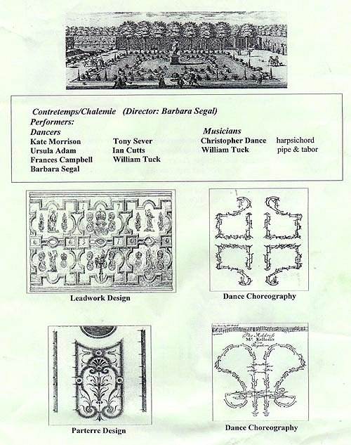 Madrigals were sung at intervals by the Grove Choir outside in the candle-lit Tradescant Garden. Inside, Barbara Segal and her Contretemps/Chalemie School of Baroque Dance and Garden Design demonstrated formal, stylized dances of the same period as the great gardens of the time, when Dance Choreography linked closely with leadwork and garden parterre design. Costumed and bewigged gentlemen paid scrupulous attention to the correct mode of address, and the dancers took their turns singing French and English songs. William Tuck managed drum and tabor simultaneously, and Christopher Dance accompanied stylishly on the spinet.