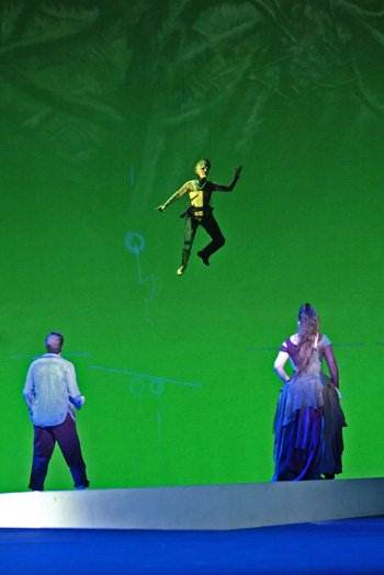 The production (Tom Cairns, with lighting by Wolfgang Göbbel) was like the music – not really up to much despite all the huge hype and vast resources lavished upon it. The opening scene’s choreography, of an ‘Ariel dancer’ gracefully tumbling over and over at almost full stage height would probably have seemed strikingly original to anyone who had not seen exactly the same thing done by Trisha Brown’s figure of Musica in the Brussels production of ‘L’Orfeo,’ and in the same way anyone not familiar with the David Pountney ENO production of ‘The Cunning Little Vixen’ would probably be enthralled with the insect movements later given to Ariel. The set seemed to be conceived as a kind of huge palimpsest for Prospero’s own stagings for the lives of the characters, brightly lit and jazzily stabbed with evocative laser work – taken on this sort of quasi-abstract level it is attractive and vibrant, with lots to engage the eye such as cuddly monsters who seem to have strayed from a student production of ‘Die Zauberflöte’ but none of it really ‘gels’ – no tempest as such, no real sense of the Island as a place of magic import.