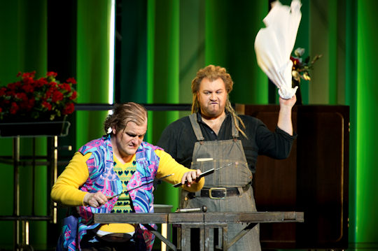 However, a crucial aspect of Mime’s portrayal edges us into the 1970s. Perhaps it would be hoping too much for subtlety in this respect, since it might therefore have gone unnoticed, but Mime appears, through Krämer’s direction, Falk Bauer’s costumes, and through Wolfgang Ablinger-Sperrhacke’s acting on stage, to be an outrageously caricatured homosexual, hand gestures, dancing and all, with definite tendencies towards transvestism at least. (Is that yet another dig at Wagner and his pink silk, I wonder?) Given that (s)he appears as something of a cross between John Inman and Mollie Sugden, I could not help but wonder whether Krämer were a devotee of Are You Being Served? Indeed I half expected Miss Johannes Brahms to enter stage left à la Baba the Turk. The concept takes us away from endless debates, whatever one thinks about them, concerning anti-Semitism, and retains the character’s outsider status, and actually seems to be permissible on stage, in a way that a ‘Jewish’ caricature of Mime, were one so inclined, would not be. It also opens up a new angle upon the echt-heterosexual Siegfried’s instinctive aversion towards a parent who claims to be both mother and father, though is actually neither, and who certainly has no offspring of his own. Whilst preparing to forge, Siegfried – immediately, one assumes, bien dans sa peau – mockingly mimics Mime’s gestures; clearly the outcast’s place is in the kitchen. Whether we consider it all a bit of fun, veering dangerously close to homophobia, or even, implausibly, making a serious point concerning gay adoption, is probably more a matter of taste, or at least sensitivity, than anything else. It occurred to me that someone with post-modernist inclination towards hyphens and parentheses might have entitled the first act ‘Mime: (A) His/her-(s)tory’; it is certainly one way to address the paucity of women in the drama. Perhaps a thesis has been launched. At any rate, a possible way of representing Siegfried’s upbringing somewhat overshadows, indeed becomes, the plot.