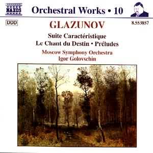 The Song of Destiny is a dramatic overture dating from 1907 and in it and the Two Preludes on this disc Glazunov commands attention strongly. The Song uses the famous Fate theme from Beethoven's Fifth Symphony and in a spirit of well-orchestrated gloom bites and strikes outwards and upwards. The atmosphere is very strong indeed and a far from obviously superior soul-mate would be Rachmaninov's Isle of the Dead. One of his most powerful scores lit by Rimskian flashes. The Suite Caractéristiqe is an epic-scaled work spanning almost 38 minutes in eight movements. It has in the past been coupled with the Middle Ages Suite. Glazunov was rather good at these character pieces. Sometimes he hit gold at other times well this suite is an example of one of his lower key inspirations - much too relaxed and low key. Highlights include the Intermezzo scherzando and a well-constructed innocent Pastorale. The Danse Orientale had already been established as a genre in Russia by the likes of Glinka and Balakirev and latterly Rimsky-Korsakov. This is another of the same ilk and good it is as well, rather in the spirit of Balakirev's First Symphony than Borodin's Polovtsian Dances. There is a reserved Tchaikovskian Elegie and a laid-back Cortège rather like the central section in Bax's 'flat beer' Coronation March. Despite some very nice work for high woodwind the final movement is not quite the satisfying conclusion it should be. Perhaps these lighter genre pieces suffer in the exalted company on this disc. Inspiration is certainly at work in the Stassoff Prelude. It is dignified, dark, fantastic (listen to the work for the high flutes) and sorrowing with a positively grown-up and angry sense of bereavement. The shudders in the music suggest that Glazunov had learnt lessons from the volcanic tumult of Tchaikovsky's Francesca da Rimini. This is an excellent work in which Glazunov seems to be reaching out in new and possibly unnerving directions. It is well worth the modest price of the disc. A work too easy to overlook especially given its literal but plodding title. The same darkness that makes such an impact in the Stassoff work also drives the much longer Rimsky Prelude. If in this context we sometimes think of Waxman's music for The Bride of Frankenstein I think we can be forgiven. The Rimini-like fumaroles and convulsions are lightened by some oriental colouring presented with reserve and avoiding Glazunov's own earlier models. It is marked andante lugubre and lugubrious it is in the long central section. The conciseness of the first prelude certainly pays off but it is only a slight shading of preference. The woodwind and horns call out in the most affecting and fresh style at 11.21. After hearing the Naxos disc I went back to a tape of a Melodiya recording of the Moscow Great SO conducted by V. Yurovsky in the Two Preludes. There is a greater impact and let's face it a close-up blare in the Melodiya. The Russian brass are fruitier and as black as poisoned caviare. The Naxos recording is a very strong contender and the only game in sight however the somewhat unsubtle Melodiya is a powerhouse of a performance. The logic of this Naxos bargain price series and its interaction with the full price Marco Polo series is a matter of speculation. Many of the shorter orchestral works were included in Marco Polo's earliest LP releases and the counterpart CDs still coexist happily in the Marco Polo catalogue. At some stage I hope to sample those CDs and compare them with this much more recent Naxos series. The clean and distinctive Glazunov head and shoulders caricature which appears as a logo on the complete series is by John Minnion whose artwork is such a strength in the Thames book Composing Mortals a series of essential profiles of British composers. The present disc is (allowance being made for the undemanding and perhaps rather anodyne charms of the suite) among the strongest in the sequence of ten containing some most original music. Reviewer Rob Barnett