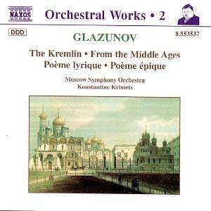 The Kremlin (which I first encountered in one of Leslie Head's St John's concerts with the Kensington SO in circa 1979) was written at about the time of the Oriental Rhapsody and the Third Symphony (both yet to come in this series). It is given an enthusiastic reception in this recording. The Popular Festival first movement is clearly a religious one and probably an Easter one given the similarity in mood with the Rimsky Russian Easter Festival Overture. It has everything: the mystery of the Russian Orthodox church and bell tolling mixed with processional and lively rhythmic material. It seemed rather close to Respighi's Church Windows without the Hollywood glow. The central cloisters section reeks of incense and echoes with chant. The mysticism of the movement is there but is not that of Scriabin in his loonier moments of deluded ambition. If you have heard Respighi's orchestration of the fifth of five Etudes-Tableaux you will generally know what to expect. The Entrance and Coronation of The Prince is relaxed - dressed in Rimskyian finery and played with splashy enthusiasm. If a touch of routine 'chug-chug' pacing begins to enter the proceedings we can put this down to Glazunov rather than the performers. At the climactic close Tchaikovsky does put in an appearance but it is the Tchaikovsky of Hamlet and Fatum rather than Romeo or Francesca. I am not aware of any other recordings currently available although I seem to recall a Colosseum LP with the Nuremberg SO conducted by Zsolt Deaky (memory may be at fault here). The Kremlin was not one of those works that attracted Melodiya during the 1960s and 1970s and as far as I know the present recording is either unique or one of very few. In The Middle Ages is a more concentrated and successful work. The Prelude broods and squawls in iron black clouds. This atmosphere is relieved at 3.35 by one of his tenderest tunes - so Russian - almost tipping over into Rachmaninov's second symphony. The Scherzo's strings zip along and Dies Irae puts in an appearance in the oboe part. The dark brass signature at 2.01 is decidedly Sibelian in Lemminkainen mood. Troubadours sings a sweet archaic song with a soft harp beating soft heart-beating. This is very attractive and memorable music on which Miklos Rózsa may well have dwelt in forming his own style. The Crusaders Finale is celebratory, ending in a cheerily autumnal march. Jarvi's competing 1980s Chandos sound was rich to the point of congestion; not a good quality in the case of Glazunov. Here the lucidity of the Naxos DDD recording pays off. A stronger work than it is given credit for. There are two Poèmes. The earlier is the better of the two. Lyrique's adagio tune is a possible progenitor of the great Rachmaninov second again, with its soft focus strings and fruity horns - the latter not prone to classic Russian warble (whatever happened to that - I rather liked it!). Most enjoyable. The very late Epique goes through the motions, basking in a warm theme of no great distinction and revelling, in a somewhat haphazard way, in some all-purpose Russian jollity. It did not have to be like this as his Saxophone Concerto (one of his very best works) of three years later amply testifies. The liner notes are again trilingual but each is different - a feast for linguists. Reviewer Rob Barnett