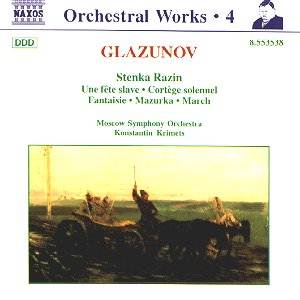 Stenka was dedicated to Borodin and apart from a tune which, for me, rather defuses than heightens the wonder, this work rates very close to Balakirev's Tamar. The strings in the opening pages rise shivering and shuddering from the marshes. A sense of doom and a thumping ache are powerfully conveyed. The brass are delightfully squat and dark. The harp sweeps have one reminiscing about Tchaikovsky's 4th symphony and Rimsky in Sheherazade. At the final section the gale shrieks high through the 'voices' of the strings and woodwind and the 'Volga Boat Song' resonates in kitsch gaudiness above the tumult. Apart from that tune the only compromising quality was that the strings seemed under-nourished - perhaps a function of the recording or balance. The notes intriguingly refer to a proposal put by the great Chaliapin to Glazunov to write an opera on Stepan Razin in collaboration with Gogol. Nothing came of the idea. There are no Glazunov operas. Une Fête Slave is again redolent of Borodin and Balakirev and is a most joyous piece. There is some fine quiet playing. The work is one of a host of small orchestral sketches and genre pieces that flooded from Glazunov's pen during the period 1881-1915. The essay is an orchestration of the finale from the third string quartet. The Cortège Solennel is one of two, this being the earliest. It is by turns gracious, clear-eyed, skittish in its central section and the woodwind make a fine contribution though obviously tested to the edge. It is not specially solemn. The Fantasy - From Dark to Light sounds rather Lisztian (From the Cradle to the Grave - rather the reverse I suppose, but you can see where the inspiration may have come). The tremulous strings chart sombre territory. As the music progresses we seem to move from bereavement to joy in recollection. At 7.48 the downward stepping trombones mark a swinging into more hedonistic gear. It is however only fitfully engaging and was perhaps a sign that the candle was burning lower or only occasionally. Glazunov knows his box of tricks and takes them all out for a run but the engagement is just not there. It is a different matter in Nathan Rakhlin's apocalyptic rendering of the Fantasy on an ancient Melodiya (I have a tape not the original LP). Rakhlin seems to have been rather a good advocate of Glazunov as also is Boris Khaikhin neither of whose Melodiyas seem to have attracted the attention of the dedicated reissuers. The Mazurka is one of those orchestral dances. Gracious and a touch sentimental. It is nicely swung here with some great horn playing rising in a rough wave,. The March is relaxed and easily flowing with light-toned confidence and a touch of the slightly jokey edge that Korngold brought to his march sequence in the film music for The Adventures of Robin Hood. The piece ends in a nice helping of Russian shindig. Reviewer Rob Barnett