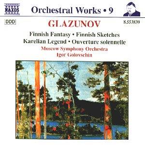 The Finnish Fantasy is one of those landmark works in my discovery of Glazunov. I first became acquainted with it on a Melodiya LP - I wish I could recall whose the performance was. In any event it captured my attention immediately, combining Russian and Finnish spirit both of which already laid a strong hold on my musical interests. I always wondered about Glazunov's other Finnish works and it is only now that I have had the opportunity to uncover them. All three Finnish works dates from late in his career. The Fantasy seems to resonate with many influences - Tchaik 4 in the deep bassoon theme near the beginning, Brahms' St Anthony Chorale with the woodwind cooling the ardour of the strings, some lightly Sibelian moments, a touch of the doom-burdened brass of the Manfred Symphony (in Svetlanov's furnace of a performance on BMG-Melodiya) and a final Lutheran chorale to top things off. I am sorry to say that while there are many attractive moments the work did not live up to memories of that ancient Melodiya. I must try to track it down. There are two Finnish Sketches. The first is from the Kalevala evoking shepherds piping around a fire in a snowy waste or at a village celebration. The second sketch is a solemn processional. The Karelian Legend is a major work of 21 minutes duration. It is dedicated to a pupil of Rimsky, the Latvian composer Joseps Wihtol (I hope to review some Wihtol as soon as possible). The Sibelian accents are stronger here although they by no means predominate. Startlingly Delian cuckoo calls warm the chilly vistas (5.10) and some bardic and Slavonic brass rend the air in unusual warlike harshness. From the heights Glazunov winds down into woodland pastoral and those cuckoos again! A nice work - well worth getting to know. The Ouverture Solennelle is fluent and not especially solemn - rather serene with a touch of the salon about it. The cantering Wedding March is touched with Slavonic pomp. The cover portrait (not always used to best advantage in Naxos's trademark sleeve design) is easily the best of the sequence of ten volumes. It uses a ruddily gaudy woodland painting by the famous Finnish artist Akseli Gallen-Kalela. Reviewer Rob Barnett