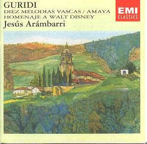 JESUS GURIDI - HIS ORCHESTRAL WORKS: DIEZ MELODIAS VASCAS (1941) for Orchestra, HOMENAJE A WALT DISNEY (1956) for Piano and Orchestra,  UNA AVENTURA DE DON QUIJOTE (1916) Symphonic Poem, EUZKO IRUDIAK (1922) for choir and orchestra Euskadiko Orkestra Sinfonikoa (Basque National Orchestra); Orfeon Donostiarra, choir; Ricardo Requejo, piano; Miguel A. Gomez Martinez, conductor With funding from Eusko Jaurlaritza (Gobierno Vasco), Mondragon Corporacion Cooperativa and Gasnalsa. CLAVES RECORDS CD 50-9709 [RB]