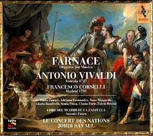 At first glance, this set, which includes Vivaldi’s 1727 opera Farnace and excerpts from Corselli’s 1739 version, incites nothing but questions. Why has Savall chosen to break up the Vivaldi work by adding the few movements and arias of the Corselli? This music - a total of 23 minutes - is split into three parts, appearing at the beginning of each disc. This is certainly annoying for someone wanting to listen to the Vivaldi, but why even add this music, other than to fill the empty space that would have existed on these three discs? It is true that this allows the Vivaldi to be neatly separated one act per disc. But why, also, did he change two of the important roles, including the title role of Farnace, from their original castrati (now counter-tenors or sopranos) to baritones? |