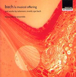 Johann Sebastian BACH (1685-1750) Trio Sonata from A Musical Offering BWV1079 VIVALDI - Trio in A minor rv86 C.P.E. BACH - Trio Sonata in C major h571 (wq147) TELEMANN - Parisian Quartet no.3 in A major The Academy Ensemble Rec: ?, Cranleigh School Chapel (original release in 1992). |