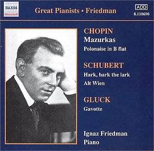 Until Rubinstein recorded his first set of the complete Mazurkas in 1939-40, Friedman’s four 78s, all present here, were the most comprehensive selection from a single artist. The Rubinstein set is already available on Naxos and has been reviewed by me, as have been notable sets by Nina Milkina and Joyce Hatto. If you hop back and forth between Friedman and any one of these three, you will probably get a heart attack and will certainly miss the point of what Friedman is doing. It is true that, looked at coldly with a score in front of one, he can seem pretty much a law unto himself. Dynamics are upgraded and downgraded at will, bass notes are thickened. He can sometimes surge forward so impetuously that it’s difficult to be sure if he has played all the notes. He inserts expressive commas here and there and the mazurkas’ rhythms can sometimes lead to such a separation between the second and third beat that every bar seems to have a hiccough in the middle of it. But then close your eyes and just listen to how the music speaks, how one moment it dances gracefully, how the next it evokes peasant instruments, and how it then speaks of infinite melancholy. The sounds and sensations of Chopin’s loving evocations of his homeland are uniquely realised. Note, too, how he takes a little-known Polonaise (not included by Rubinstein in his "complete" Polonaise recordings) and makes it blossom into a thing of real beauty. A little voice inside me says it ought to be possible to realise them while remaining close to the letter of the score, but the fact is that no-one has done so. Basically, I am in favour of a "purist", non-interventionist style of musical interpretation, but there are a few artists whose sheer creativity makes me wonder if I haven’t been getting it wrong all these years, and Friedman is chief among them.