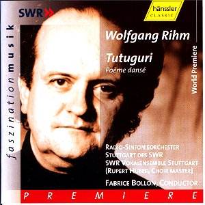 The poem Tutuguri – Le rite du soleil noir is an apocalyptic, if rather enigmatic vision of death and destruction, ending with the blasphemous image of the Cross replaced by a huge horseshoe dipped in the rider’s blood. It calls forth some strong verbal imagery which undoubtedly impressed Rihm and had him thinking about a large-scale piece based on the poem as well as on Artaud’s life and work. (The third tableau alludes to the Peyotl dance, i.e. an episode of Artaud’s Mexican trip.) Rihm describes the poem as the "presentation of a dark, fierce cult". In Artaud’s words: "Now, the key of the Rite is precisely/THE ABOLITION OF THE CROSS". Tutuguri for speaker, chorus and large orchestra with a huge percussion section consists of four sizeable tableaux. The first, bipartite tableau opens with a long introduction. The music arises, as it were, out of the void with a lonely flute soon engulfed in some frantic percussive music. The second part is mostly for orchestra, still with much percussion, alternating almost static episodes and wildly energetic, heavily pounding passages sometimes reminiscent of Varèse or of Xenakis. About halfway into the movement, the chorus has its first entry with rhythmic delivery of vowels and syllables accompanied by hand clapping. (Neither the chorus nor the speaker ever use words or parts of the poem.) Roughly speaking, the second tableau might be seen as the slow movement, though it is full of dynamic extremes (a Rihm characteristic, if ever there was one). Rattling percussion opens the third tableau (The Peyotl dance) in a mysterious, menacing mood leading into an insistent, obstinate dance, again with percussion much to the fore. Halfway through the movement, the chorus has its second brief entry. A slower section slowly leads into the violent coda (again shouts from the chorus with much percussion accompaniment). The fourth tableau, the longest (and, to my mind, the weakest) is a long movement entirely scored for percussion including some shouting (from the chorus? From the players? Or both?).