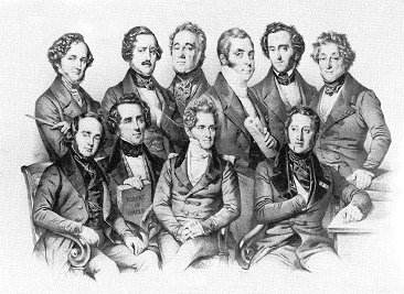 Gallery of the modern lyric composers by A. Maurin (1844). From left to right, 1st raw: Halévy, Meyerbeer, Spontini, Rossini ; 2nd raw: Berlioz, Donizetti, Onslow, Auber, Mendelssohn, Berton.