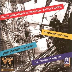 For Korngold to produce a symphony in the post-war era when so many composers were qualifying this form with adjectives such as ‘chamber’, ‘simple’ or even ‘short’ and only Shostakovich, Vaughan Williams, and, once again, Walton were sticking to their symphonic guns, was a brave move. The music is nothing like the film music, and indeed it transpires he had been working on it for over thirty years. It’s a huge late-romantic work, effectively out of date before he had completed it, but he clearly did not want to travel the path of serialism or atonalism. Its ambiguities lie further in the absence of modality, deliberately avoiding the words ‘major’ or ‘minor’ in the key title, rather leaving it to the implications of the moment. Key relationships are deconstructed, there is none between the first and second subjects of the first movement (F sharp to C major), the development has a thrilling tension with some allusion to his film style before concluding mysteriously in woodwind dominated passages (Track 2: 08’50") before the recapitulation, where we hear once again the unison theme of the harsh, dramatic material at the start. The Scherzo is a tarantella (with thrilling horn passages which hark back to film scores, Track 3: 08.30") followed by a surreal and sparsely scored trio, while the slow movement is a Mahlerian funeral march, the emotional epicentre of the work. The main theme is a transformed version of the Death March for the Earl of Essex composed in 1939 for another Flynn (and Bette Davis) film, The Private Lives of Elizabeth and Essex. The build up from Track 4, 05’.10" to one of three climaxes Track 4, 06’20" exemplifies the outpouring of emotionally rich material at this composer’s fingertips. The work ends with a rather abrupt mood swing to a jauntily joyous Rondo, in which the earlier movements are recalled at various places. This is an excellent performance by the Oregon Symphony [Orchestra] under James DePreist in the surround sound of Delos’s Virtual Reality Recording made in the spatial acoustics of the University auditorium in Newberg, Oregon. The symphony has had its interpreters over the years, the late Rudolf Kempe with the Munich Philharmonic Orchestra in 1972 and Werner Andreas Albert’s 1988 compilation for cpo with the Nordwestdeutsche Philharmonie, but this is as good as it gets. Christopher Fifield see also review by Rob Barnett |