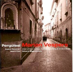 BATTISTA PERGOLESI (1710-1736) Marian Vespers CD 1 Deus,In Adjutorium (Introit) Gloria Patri Sicut Erat In Principio Alleluia Dixit Dominus (1. Psalm) Virgam Virtutis Dominare Tecum Principium Juravit Dominus Dominus A Dextris Gloria Patri Sicut Erat In Principio Sonata for Violin and Basso Continuo Allegro Confitebor (2. Psalm) Confessio Fidelia Omnia Redemptionem Misit Sanctum Et Terribile Gloria Patri Sicut Erat In Principio Sonata for Violin and Basso Continuo Spirituoso Laudate Pueri (3. Psalm) A Solis Ortu Excelsus Super Omnes Quis Sicut Dominus Suscitans A Terra Gloria Patri Sicut Erat In Principio CD 2 Lucis Creator Optime (Hymn) Sonata for Cello and Basso Continuo Comodo Allegro Magnificat Anima Mea (Magnificat) Quia Fecit Mihi Magna Suscepit Gloria Patri Sonata for Cello and Basso Continuo Adagio Presto Salve Ad Te Clamamus Ad Te Suspiramus Eia Ergo Et Jesum Benedictum O Clemens Ora Pro Nobis (Collect) Amen Sonata for Organ Sophie Daneman, Noemi Kiss, Julie Cooper, Rebecca Ryan, William Purefoy, Richard Wyn Roberts, Benjamin Hullett, Matthew Beale, Simon Birchell, Robert McDonald The Choir of New College, Rec: July 2002, St. Jude’s Church, Hampstead Garden Suburb, |