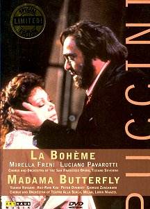 Packaged conveniently as a cheap double DVD set, these two discs should do well in the general music lovers market. Both productions are safe, reliable and thoroughly traditional, with no hint of controversy or ‘boat-rocking’ to upset anyone. I have lived with the Bohème for some time now, having bought it on its first video release in 1989. With sharper picture and infinitely better sound quality, there is obvious enjoyment to be had, though the same irritations I have always had are still there. These centre on the tiresomely outdated practice of curtain calls after every act, as well as thunderous applause for every ‘big’ aria or set piece. It’s doubtful whether any modern theatre director worth their salt would allow this, as it seriously disrupts dramatic flow and credibility, and gets worse on repeated viewings. At least the singers hold their poses during the rapturous clapping, and they are obviously from performing traditions where this happens a lot. But compared with, say, Baz Luhrmann’s grippingly provocative Sydney production, set in the 1950s and with vibrant young singers (now wowing Broadway and in serious need of transfer to DVD), this all seems a mite quaint and old fashioned. Still, there is much to enjoy, with the starry cast in good voice and very experienced in their roles.