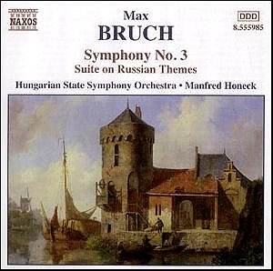 With a performance of the third symphony to conduct within days of hearing this disc, it has been much in the forefront of my mind, and despite reviews already posted on the website by two colleagues, I feel moved to add an opinion, particularly about the symphony. I must also declare myself as Bruch’s biographer and probably among both his fiercest champions and his harshest critics. He tackled all recognised forms, excelling in the concerted works for violin, with the first head and shoulders above anything else he penned. His choral music needs more attention than it gets on the performing circuit (there’s a reasonable amount on record, though rather paradoxically of the larger, therefore more expensive, works to mount when it comes to planning a season), and I applaud Gerard Schwarz’s enthusiasm with his Royal Liverpool Philharmonic Orchestra. Bruch is also a top-class melodist with the folkmusic from colder lands (Scotland to Iceland via Sweden and Russia) a favoured source. On this disc the Suite is given a robust performance despite the arid acoustics of the recording studio, which has hopefully given way since 1987 (the year of this take) to something more resonant. Honeck lingers sympathetically where Bruch shines the focus on his favourite instruments, the combination of harp and cor anglais at the start a typical example. The adagio sostenuto has its vital funereal quality despite some internal rough blending and suspect-to-dire intonation within the brass and winds. Its sweet-toned violin solo is stylishly shaped followed by a paced outburst to the climax, where the strings bask in the joys of another of his melodies. The energetic ‘Song of the Volga Boatmen’ suffers most from the dry Hungaroton’s studio, the cymbal clashes in danger of making it all sound like a parody and too daft for words.