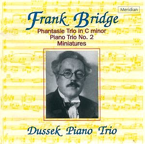 This Meridian contrasts with and complements Hyperion's Helios CDH55063 in which the Dartington Trio tackle the same two Bridge trios [see also Black Box where you can listen to samples of the music- LM]. In place of the Dussek's Miniatures the Dartingtons (augmented) offer the more substantial Phantasy Piano Quartet. The two Cobbett-Phantasy works belong to Bridge's early romantic phase; both at the high watermark of rolling exultant lyricism. The Phantasie Trio in particular is a work by which to warm your hands and heart. It is done equally well by Dusseks and Dartingtons with the Dusseks favoured by a slightly cooler ambience which suits the Bergian tendrils of the Piano Trio No. 2 rather more than the Phantasie world. On the other hand the Meridian disc offers greater playing time and the Miniatures are a rare item that no Bridge enthusiast will want to miss. While the Meridian lacks the Phantasy Quartet and thus stays true to its core artists - using a piano trio throughout - the Miniatures are from the same era as the Phantasy Quartet and so are a more uniform choice. These nine pieces have titles six of which are dance-based with a Romance, Intermezzo and March Militaire - the latter finishing the set. Bridge was good at these miniature pieces and did similar things for string quartet, cello and piano and of course acreages solo piano morsels (on four Continuum CDs). The Miniatures are pretty much charming light music: accomplished mood pastels, sighs, vintage antiquery, salon refreshments for conservatory concerts. They are patently more sincere than the gimcrack peddled by some of the lighter British practitioners such as Ketèlbey. The Romance and Valse Russe link to the spattering of Bridge pieces for cello and piano and indeed to Fauré's similar works. Bridge is good at joy - you can hear it breaking out uncontrollably in both the Saltarello and Hornpipe.