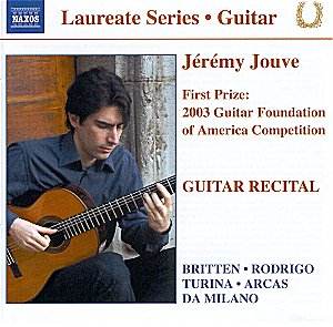 Quite recently I reviewed a disc in Naxos’s Laureate Series with winners of important guitar competitions. Then it was the young Spaniard Pablo Sáinz Villegas; here comes another disc in the same series with the even younger Frenchman Jérémy Jouve. Both were recorded on consecutive days in May 2004 in Ontario, Canada with the experienced production team Norbert Kraft and Bonnie Silver, although in different venues. The change of location does, not change the quality of the recording: this is the warm, rounded and yet transparent sound we have come to expect from this team. When it comes to the quality of the playing I have to say again that I have still to hear a merely good player on a Naxos guitar disc. They have all been superb and Jérémy Jouve is no exception.