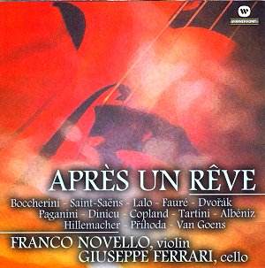 Après Un Rêve Gabriel FAURĖ (1845-1924) Après Un Rève * Váša PŘİHODA (1900-1960) Capriccio + Ländler in A major * Paul Joseph HILLEMACHER 1852-1933) Gavotte tender * Luigi BOCCHERINI (1724-1805) Adagio from Cello Concerto in B flat major * Franco NOVELLO (1929-1993) Malinconia + Daniel Van GOENS (1858-1904) Scherzo Op. 12 * Edouard LALO (1823-1892) Lento (Chants russes) from Cello Concerto in D major * Giuseppe TARTINI (1692-1770) Grave from Cello Concerto in D major * Aaron COPLAND (1900-1990) Two Pieces for Violin and Piano: Notturno and Ukelele Serenade + Nicolo PAGANINI (1782-1840) Adagio from Violin Concerto + Isaac ALBĖNIZ (1860-1909) Tango + Antonín DVOŘÁK (1841-1904) Melodia from Largo (New World Symphony) + Charles-Camille SAINT-SAËNS (1835-1921) Le Cygne from Carnival des animeaux * Gheorghe (Grigoras) DINICU (1889-1949) Hora Staccato + (recorded in 1956) * Giuseppe Ferrari (cello) and Roberto Cognazzo (piano) (recorded in 1969) |