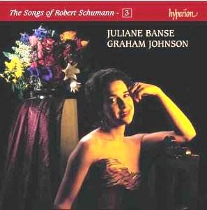 The opening song Loreley is under-rated. Notice how both the pianist and singer emerge from the depths as it were and the magnificent vocal control. Nostalgia without wallowing. Jasminenstrauch is a glorious song with filigree piano writing. Sag an, o lieber Vogel mein is a narrative song sung with a compelling and beautiful simplicity. It is a song that hovers between a scene of domestic bliss and a lullaby. My, how well it is sung and those rich top notes which still send shivers down my spine! Der Kartenlegerin, the Fortune teller, is absolute fun and the unexaggerated comic style reveals Banse's understanding of this song. It is almost operatic in style . The composer has captured the femininity of the song which is about a sixteen year old who is something of a coquette. Note the importance of the piano part. It is not just a Schubertian type support. Blondel's Song is also a substantial song in which each of the verses end Suche treu, so findest du which translated is Seek in faith and you shall find. It reveals Schumann's interest in history and the subject of this narrative song is Richard I who was imprisoned in 1192 by Leopold of Austria. The songs of Mary, Queen of Scots follow; another example of Schumann's interest in history. Blondel's song to King Richard is a little long but the variety that Banse brings to this keeps our interest. Note the quality and commitment of Graham Johnson's accompaniment.