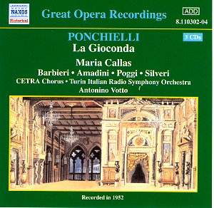 For their third Callas re-issue in January 2004, Naxos Historical has chosen the diva’s first recording of La Gioconda, re-mastered from the original Cetra LPs by Ward Marston. Cetra had contracted Callas to record three operas before Walter Legge signed her up to an exclusive contract with the Columbia (Angel in the USA) label in July 1952. Cetra in fact recorded only two operas under their contract, this Gioconda and La Traviata, both made in September 1952. It would be interesting to know if a title was agreed for the third opera and the reason why the contract was never fulfilled. Cetra had built up an enviable, and unequalled, operatic catalogue at that time, and aware of Callas’s burgeoning international career it was unlike them to miss such an obvious commercial opportunity.