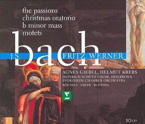 So, how does one sum up such a substantial collection? Well, it's a treasure trove of masterpieces and the whole box is a marvellous testament to the skills of Fritz Werner as a Bach interpreter. As is only to be expected, perhaps, with a collection of performances set down over some 11 years, it is an uneven achievement. I don't believe the B Minor Mass shows Werner at his best, though in part at least this is down to the sound quality. I wish he'd been given the opportunity to re-record it with the benefit of improved techniques in recording and, perhaps, among his choir. On the other hand, the performance of the St. John Passion is a very good one, that of the Christmas Oratorio is excellent and the St Matthew Passion is particularly fine.
