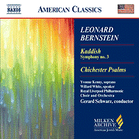 Chichester Psalms, a choral mainstay when referring to Judaically related programming, kicks off with gusto, in even more than the ‘slightly popular’ style that those who commissioned the work (the artistically enlightened Dean of Chichester Cathedral, the Very Reverend Dr. Walter Hussey) might have had in mind. Dr. Hussey ensured that Bernstein was allowed complete artistic freedom in his composition, and was rewarded with joy, serenity and eloquence in a work which has already proved its worth with a permanent place in the concert repertoire. Bernstein himself said that ‘the Psalms are like an infantile version of Kaddish’, thereby blessing the coupling on this CD, which is of course identical to those of his own NY Philharmonic recording. It has been too long since hearing the NY Phil/Bernstein record for me to make any really useful comparison. Those who know and love those elderly recordings will probably find the current CD does not replace it for musical intensity or dramatic fervour, but with the advantage of modern digital technology this low-price issue has much to recommend it, and would be a valuable addition to any collection.