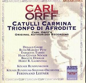 Carl ORFF (1895-1982) Catulli Carmina (1943) Donald Grobe (tenor) – Catallus Ruth-Margaret Pütz (soprano) - Lesbia Trionfo di Afrodite (1950-51) Enriqueta Tarrés (soprano) – Sposa Donald Grobe (tenor) – Sposo Hans Günter Nöcker (bass) – Corifeo Brigitte Dürrler (soprano) – Corifea Horst R Laubenthal (tenor) – Corifeo Cologne Radio Choir Cologne Radio Symphony Orchestra/Ferdinand Leitner Recorded Cologne, 1974 ARTS ARCHIVES 43002-2 [75.00] [JW]