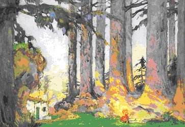 Rautendelein, a pretty young elf-girl, is seated on the edge of a well combing her long blonde hair. Mischievously, she shouts down into the well to awaken the old water-sprite, Ondino, who tells her not to be so impertinent. Rautendelein laughs at the cheerless well-dweller and filled with the exuberance of youth, dances about the meadow. A faun enters and tries to induce the elf-girl into the bushes for a frolic but she mocks him and runs away. Ondino asks the faun for news. The faun observes that the humans are erecting a church on the mountainside and that were it not for his quick thinking a noisy bell would already be hanging in the steeple. The faun then boasts that it was he who had wrecked the cart carrying the bell up the steep slope injuring Enrico, the caster of the bell, and sending the bell plummeting over the edge of the cliff to where it now rests in silence - submerged at the bottom of the high lake. Their conversation is interrupted by the arrival of the badly injured Enrico who collapses near the door of a small hut. The faun dashes away into the forest and Ondino dives down the well at Enrico’s approach.