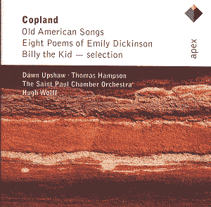 In “Eight Poems of Emily Dickinson” Copland set works by the American poet for voice and orchestra from his 1950 work “Twelve Poems of Emily Dickinson” for voice and piano. In the liner notes Vivian Perlis writes that the songs present special challenges for the performers as they are cast in “irregular meters and stanzas (with) wide jumps in the vocal lines, and difficult chromatic passages for the pianist”. Well the St Paul Chamber Orchestra have no problem with this orchestral version and Dawn Upshaw sings them as if they’d been written just for her. It is difficult to imagine anyone who could sing them more convincingly. She deals with the challenges as if they didn’t exist. All the words of all the songs are included in the booklet though one hardly needs them as Dawn Upshaw’s diction is superlative and nothing is lost in the singing. Their inclusion does however enable the listener to understand the motivation that convinced Copland to set this beautifully lyrical poetry. Although the work initially received a cool reception the songs are now recognised as being among Copland’s greatest achievements.
