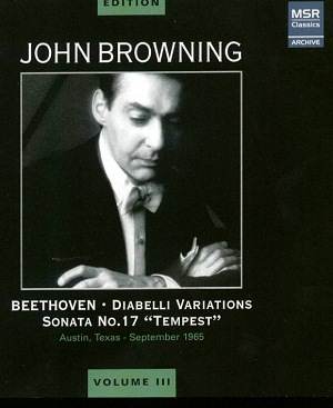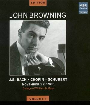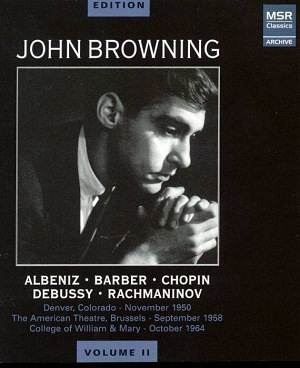 Edition Volume 1 Spoken Introduction by John Browning [1.29] Johann Sebastian BACH (1685-1750) Chorale Prelude – Ich ruf zu dir, Herr Jesu Christ BWV639 [4.33] Fryderyk CHOPIN (1810-1849) Fantasy in F minor Op.49 [12.59] Mazurka in F minor Op.63 No.2 – recording incomplete [2.14] Mazurka in F minor Op.68 No.4 [2.25] Sonata No.2 in B flat minor Op.35 [30.44] Franz SCHUBERT (1797-1828) Impromptu in A flat major [5.30] John Browning (piano) rec. College of William and Mary, Williamsburg, Virginia, 22 November 1963 MSR CLASSICS MS 1120 [50.55] The John Browning Edition Volume 2 Fryderyk CHOPIN (1810-1849) Etude in C minor Op.25 [2.38] Nocturne in D flat major Op.27 No.2 [7.07] Claude DEBUSSY (1862-1918) La Soirée dans Grenade (Estampes) [5.23] Deux d’artifice (Préludes II, No.12) [4.33] Samuel BARBER (1910-1981) Sonata for piano Op.26 [19.38] With spoken introduction to the above [1.27] Sergei RACHMANINOFF (1873-1943) Etude-Tableaux No.2 in C major Op.33 [2.38] Etude-Tableaux No.5 in E flat minor Op.39 [5.23] Etude-Tableaux No.3 in C minor Op.33 [5.38] Prelude in G major Op.32 No.5 [3.12] Manuel de FALLA (1876-1946) Andaluza (Piezas Españolas No.4) [4.23] Isaac ALBÉNIZ (1860-1909) El Puerto – Iberia [3.42] Nicolai RIMSKY-KORSAKOV (1844-1908) The Flight of the Bumblebee – arranged Sergei RACHMININOFF [1.22] Francis HENDRICKS Etude in B flat minor [3.26] John Browning (piano) Recorded in Denver, Colorado, 1950 (Nos.1 and 17), American Theatre Brussels, 1958 (13, 16) College of William and Mary, Williamsburg, Virginia. 1964 (14, 15) and unknown locations and dates (2-12) MSR CLASSICS MS 1121 [70.28] The John Browning Edition Volume 3 Ludwig van BEETHOVEN (1770-1827) Variations on a Waltz by Anton Diabelli Op.120 [53.56] Piano Sonata No.17 in D minor Op.31 No.2 Tempest [18.43] John Browning (piano) Recorded in Austin, Texas, 1965 (Diabelli) and unknown (Tempest) MSR CLASSICS MS 1122 [72.43] The John Browning Edition Volume 4 Johann Sebastian BACH (1685-1750) Italian Concerto in F major BWV 971 [12.29] Prelude from Prelude, Fugue and Allegro in E flat major for lute BWV 998 [3.23] Organ prelude and Fugue in A minor BWV 543 Arranged Franz LISZT (1811-1886) Joseph HAYDN (1732-1809) Piano Sonata No.50 in D major Hob.XVI: 37 [8.57] Wolfgang Amadeus MOZART (1756-1791) Piano Sonata in C minor K457 [19.36] Rondo in F major K616 [6.28] Domenico SCARLATTI (1685-1757) Sonata in E major K380 L23 [3.12] Recorded American Theatre Brussels, 1958 (Organ Prelude), College of William and Mary, Williamsburg, Virginia. 1964 (Haydn and Mozart Sonatas) unknown location and dates, remainder |