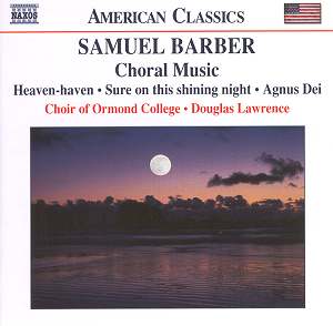 Samuel BARBER (1910-1981) Choral Music A Stopwatch and an Ordnance Map, Op. 15 (1940) [5.25] Under the Willow Tree from opera Vanessa, Op. 32, Act II (1956-57) [3.23] Two Pieces, Op. 42: (Twelfth Night, Op. 42/1 (1968) [4:32]; To be sung on the water, Op. 42/2 (1968-69) [2:48]) The Monk and his Cat from Hermit Songs, Op. 29, No. 8 (1953 arranged for chorus 1967) [2:13] Agnus Dei, Op. 11 (1967 vocal arrangement of Adagio for Strings, Op. 11 1936) [5:55] Reincarnations, a trio of Celtic part-songs, Op. 16 (1940): (Mary Hynes, Op. 16/1 [2:44]; Anthony O’Daly, Op. 16/2 [3:49]; The Coolin, Op. 16/3 [3:13]) Two Pieces, Op. 8: (The Virgin Martyrs, Op. 8/1 (1935) [3:39]; Let Down the Bars, O Death, Op. 8/2 (1936) [1:53]) Two songs from the set of 4 Songs, Op. 13: (Heaven-haven, Op. 13/1 (1936, arr. for chorus 1961) [1:43]; Sure on this shining night, Op. 13/3 (1936, arr. for chorus 1941) [2:03]) Chorale for Ascension Day - Easter Chorale (1964) [3:02] Two choruses from opera Antony and Cleopatra, Op. 40, Act III (1966): (On the death of Antony [3:11]; On the death of Cleopatra [2:51]) God’s Grandeur (1938) [7:44] Grantley McDonald (tenor) Len Vorster (piano) Choir of Ormond College, University of Melbourne/Douglas Lawrence rec. August 2000, Ormond College Chapel, University of Melbourne, Australia. DDD