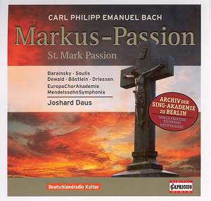 The performance is a world premiere recording of the 1786 Passion. The choruses are finely marshalled and controlled, and solo contributions though variable are thoughtful and musical. Mezzo Maria Soulis has a grave and perceptive approach to the texts – her aria Nein, ich fliehe nicht dein Kreuz is finely nuanced though her vibrato has a tendency to widen too much. Sometimes C.P.E Bach will surprise us, as he does with the unusually brisk and cheerful chorus Von Ewigkeit warst du bestimmt. An example of Bach’s instrumental flair comes in the aria [No.9] Durchdenk ich meines Heilands Leben where we find the wind writing very personable and more to the point strongly to the fore.