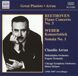 The Weber Konzertstück was recorded a year earlier than the Beethoven. The accompanist was Désiré Defauw whose performance here is usually written off. Defauw was a good musician – violinist and conductor – but he wasn’t helped by the recording which was very cloudy, a problem that Obert-Thorn has sought to address in his transfer, and by his own rather stolid approach.  Arrau always remembered a pre-War performance of the work given in Berlin by Schnabel – played beautifully he added – and it was a work Arrau kept in his repertoire until the end, by which time his work-list had shrunk to Thibaud-like parsimony. Arrau’s articulation has a bejewelled beauty to it, despite the limitations of the recording, and a ripe aplomb in the finale. The Sonata was Arrau’s first American studio recording. It was boxy, sounding rather like some of those pre-war Parisian ones, and pressed on inferior wartime shellac, but the playing is vital and communicative.
