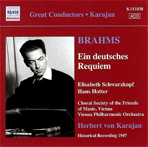 The first Vienna production was given by The Choral Society of the Friends of Music and this is the choir that Herbert von Karajan engaged for this, the first commercial recording of the work. Vienna by then, in 1947, was still severely affected by the war: the political situation was unstable, the electricity could not always be trusted and the city was divided into four zones by the Allies. With Walter Legge as producer and Douglas Larter as engineer they managed to record the work successfully and considering that it was set down sixty years ago the quality of the sound is indeed impressive. A work of these dimensions ideally requires stereo recording to convey the full impact but listening with headphones, as I regularly do when reviewing, there is enough detail to be heard for full enjoyment of this sombre but warm work. Just two years after the war was over it is also remarkable that musical life had recovered to such an extent. The Vienna Philharmonic play beautifully and though there are occasionally individual voices that protrude from the collective of the choir it is still a homogeneous sound-picture. Most impressive is the singing in the fugal passages, notably in movements three and six, with pinpoint precision and no lack of power. But the beautifully serene fourth movement, Wie lieblich sind deine Wohnungen, is also as reverential as it should be. It is worth noting that Karajan was associated with the choir from the year of this recording, 1947, until his death in 1989, directing them in over 250 performances.