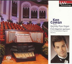 This is a substantial recital by one of America’s younger stars in the organ firmament. Recorded in the August heat of 2006, the photos from the recording session inside the booklet show Ken and the team are clearly warm enough, and mention is made of the problems of recording in such conditions in terms of tuning – even with the air-conditioning in the church. Little of this is apparent on the recording however, and the Quimby Pipe Organ, an ‘heroic’ instrument named for Michael Quimby and the Quimby firm whose work brought together elements from several different instrument to create this no holds barred blockbuster.