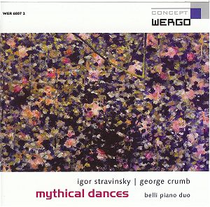 Le Sacre du printemps on pianos in various forms has been something of a collector’s hobby for me. Stravinsky’s own piano duet version is not the only variant available, but there are several versions of this on disc, with just two being Philip Moore and Simon Crawford-Philips on Deux-Elles and on Naxos, with Benjamin Frith and Peter Hill. Observant critics will see that this latter release sports the label ‘Music for two pianos’, but before I get ‘aghast’ e-mails claiming gross incompetence on my part I would just like to point out that the earlier edition says ‘Music for Four Hands’, the ‘Rite’ indeed being the ‘right’ version for piano duet as opposed to piano duo. Out of these I find myself preferring the Naxos recording these days, with its greater sense of atmosphere in the recording. Dag Achatz and Roland Pöntinen’s recording on BIS should also be considered. I was initially happier with Enrico and Olivia Belli in their Stravinsky over their Crumb, but alarm bells rather than ‘Mythical Dances’ soon started ringing.