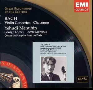 I’m not going to detain you long regarding these classic performances. They show the young Menuhin in seraphic form, marshalled by his then teacher Enescu in the two solo concertos. The older man then joins his pupil for the Double Concerto and as a bonus – quite some bonus – we hear the Chaconne from the 1934 recording of the D minor Partita. As one who feels that Menuhin’s Bach playing grew in spiritual depth the older he became and that, despite deficiencies and technical limitations, those later performances take precedence over the ones made in the 1930s, nevertheless I listened to these early recordings with renewed admiration. I’ve just watched Menuhin and Oistrakh playing the Bach Double in Paris on an EMI DVD; to see Oistrakh’s gentle half smile at one of Menuhin’s most meltingly beautiful exchanges is to witness the kind of peer affection and admiration in which he was held. Even in the mid-1960s, on good days, he could play Bach as tenderly and as beautifully as any of his contemporaries.