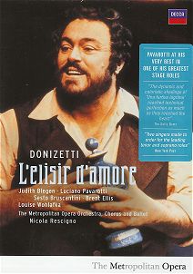 Judith Blegen (soprano) - Adina; Luciano Pavarotti (tenor) - Nemorino; Brent Ellis (baritone) - Belcore; Sesto Bruscantini (bass) - Dulcamara; Louise Wohlafka (soprano) - Giannetta; The Metropolitan Opera Orchestra, Chorus and Ballet/Nicola Rescigno