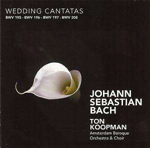 A much better example of the great virtues of the Koopman Cantata Cycle - formerly Erato, now Challenge Classics - is the disc with the Wedding Cantatas. The Amsterdam Baroque Orchestra and Chorus get to shine and Johannette Zomer, Sandrine Piau, Annette Markert, James Gilchrist and, again, Mertens are a line-up that leaves nothing to desire in “Dem Gerechten muss das Licht” BWV 195. Like “Gott ist unsre Zuversicht” BWV 197, this cantata is split in Pre- and Post-Copulationem. Since the liner-notes are trimmed versions from Koopman’s and Christoph Wolff’s originals and don’t bother to explain, this might well give rise to humorous confusion: a Bach chorale, instead of a cigarette? Alas, "pre-" and "post-copulationem" is more likely indicative of which part is sung before and after the actual marriage pronunciation … and that kiss I imagine having been no less part of tradition then, than it is now.