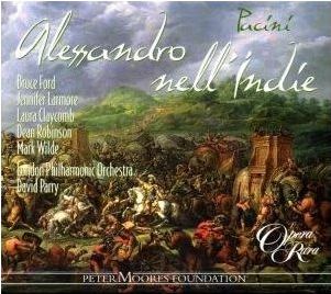 The clemency theme litters many opera libretti from the previous century including those by Mozart. Whilst Pacini’s basic musical structures differed from the earlier works of this type, he makes no effort at reflecting the venue or local colour in the music. In fact it is very penny plain and can be considered simply as a vehicle for his star singers with the background of spectacular scenery. In the Opera Rara single disc titled Pacini Rediscovered (Review) there is a track of the terzetto, Che fai fellon'... Ciel! d'una misera, that Pacini added for the Milan revision. In that performance Majella Cullagh sings Cleofide with a dramatic conviction that I do not find as convincing in the American soprano Laura Claycomb’s interpretation. Yes, her voice is appropriately flexible and even, but she fails to add enough colour and, allied to poor diction, her overall characterisation leaves me unmoved (CD 1 trs.3-8). Whilst Bruce Ford has never been the most tonally grateful and mellifluous of tenors, I find his characterisation wholly convincing in a generally pleasing account (CD 2 tr.2. and CD 3 trs.9-10) despite moments of dry tone. Jennifer Larmore, as the Indian king Poro, is not at her best, lacking that creaminess of timbre that has illuminated her bravura singing in so many Opera Rara recordings, not least the recital titled Bravura Diva (Review). I also compared her act one aria Se possano tanto (CD 1 tr.14) with her Tacete! Ohime, quei from his 1823 Temistocle on the Pacini Rediscovered disc and wondered where that creamy colour had gone. Is her voice rising towards the soprano I wonder? Lower sonority and power is also lacking in Dean Robinson’s voice as Timagene, Alessandro’s confidante. In compensation, Mark Wilde as Gandarre, General of Poro’s army, sings strongly with clear lyric tone and more than a touch of Italianate squilla to go with his good expression.