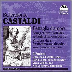 The pieces for theorbo solo and the duets for theorbo and tiorbino are from a collection which was printed in Modena in 1622. The tiorbino is twice smaller than the theorbo and its range one octave up. Castaldi claimed this instrument to be his own invention. It is the only collection with music specifically for the tiorbino which makes it an invaluable source. The most intriguing piece from this collection is the last item on this disc, the Capriccio di battaglia a due stromenti. It is part of a tradition of writing battle pieces which lasted until the 18th century. With more than 14 minutes this must be one of the longest ever written. It is stated in the booklet that as with most battaglias this ends in the minor mode. We are not told why, but one would imagine that this is an indication of the elements of a battle: some are wounded and some die. But in this recording "we have taken the liberty of ending it in the triumphant major", as David Dolata writes. Quite a strange decision, I would say, in particular if we take into account the possibility the ending in the minor mode was deliberate.
