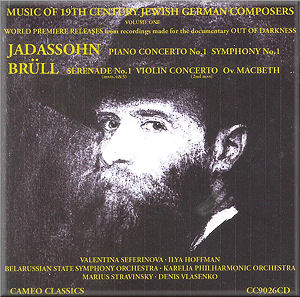 Marius Stravinsky and the Belarussian State Symphony Orchestra give Jadassohn's First Symphony a performance full of verve. It brings leaping out from its pages the fire of Schumann's Fourth Symphony and something of Dvorak 8 too. There is a Mendelssohnian joy and effervescent quality to the Scherzo which contrasts with the long and sometimes sentimental Largo e mesto. Those striding, surging and shuddering Schumann lines return for the invigorating finale. Wonderful stuff. The piece ends with a degree of conventional bombast and received convention but overall this is very attractive indeed. This is followed by a starry Andante from the Brull Violin Concerto of 1882. It seems a pity to appear by itself. However the music is heartfelt and somewhat sentimental. The ensuring two movements from the Brull Serenade No. 1 are taken from the complete recording on Cameo CC9027CD. Brull’s overture Macbeth has a typically brooding character - in essence a tone poem in microcosm in the manner of Schumann's Julius Caesar overture. In Jadassohn’s Piano Concerto we are treated to a stormy attack. Heroic shrapnel flies every which way in repeated evocations of the Liszt and Schumann piano concertos. Valentina Seferinova is fully in charge and attacks the solo part with great romantic flourish. Her stonily commanding tone is unmistakable. I did wonder about the tuning once or twice though. This is one of the romantic concertos recorded live in concert as part of a Cameo Classics video documentary on German Jewish composers whose music was suppressed. This single movement concerto as written encompasses just over 16 minutes.