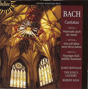 The Hyperion disc – now re-released on Helios – of Bach cantatas BWV 170, 54 and 169 is essentially a James Bowman show. A recording featuring a counter-tenor so prominently still had a touch of novelty to it when this was originally released in 1989. Now counter-tenors are about as – maybe even more – common then altos in Bach, it seems. Three of Bach’s four solo alto cantatas are included here; only BWV35, Geist und Seele wird verwirret is missing. A magnificent recording of that can be found on Sigiswald Kuijken’s new cantata series on Accent, volume 5 – with alto Petra Noskaiová.