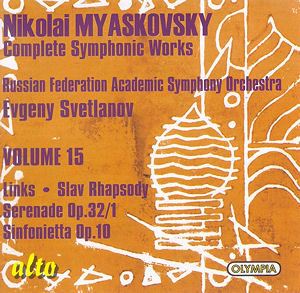 That all the symphonies have been issued on Olympia-Regis does not spell the end of the serious or heroic Myaskovsky. The title of the half hour Links suite relates to a musical chain. Towards the end of the War he turned to some early piano works written 1908-12 and reworked them. The serious-monumental mien of the first movement belies the light-as-down strings of the Allegretto which inhabits the feathery worlds of the op. 32 orchestral triptych. The auburn uncertainties and vibrato-shivering trumpet of the third movement is memorable. After a  completely characteristic Larghetto comes a sleepy Andante and an Allegro of Tchaikovskian splendour. It is very much in the tradition of the psychological waltzes of Prokofiev. The Slav Rhapsody is dedicated to Igor Boelza who wrote one the earliest English language guides to Soviet composers. The Rhapsody has the venerated weight of the Russian Orthodox liturgy which then gives way to exuberance. It is not one of his finest pieces. The Serenade is for small orchestra minus trombones. Dating from after the darker lichen paths of the Tenth Symphony, this compact three movement piece is the first chapter of the op. 32 trilogy. The festivities of the first and last movements partly echo the Slav Rhapsody but what stands out here is Svetlanov's tremendous principal trumpet and woodwind choir - the latter in the prayerful central Andante.  This piece has its moments but it is not the most distinctive of his works. The op.10 Sinfonietta is from 1910. It is in three movements. These student efforts skip in carefree abandon from Tchaikovskian fantasy to pristine Rimskian textures to a tramping Glazunov-style Rondo. The recording is gripping and Links is a much more memorable work than you may have been expecting.