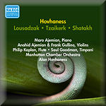 Hovhaness, Alan, Conductor • Kaplan, Philip, flute • Manhattan Chamber Orchestra • Ajemian, Maro, piano • Goodman, Saul, timpani • Ajemian, Anahid, violin • Gullino, Frank, violin: Lousadzak, Op. 48 for piano, violin and chamber orchestra; Shatakh, Op. 73b for piano and violin; Achtamar, Op. 64, No. 1 for solo piano; Tzaikerk, Op. 53 for violin, flute, timpani and chamber orchestra.
